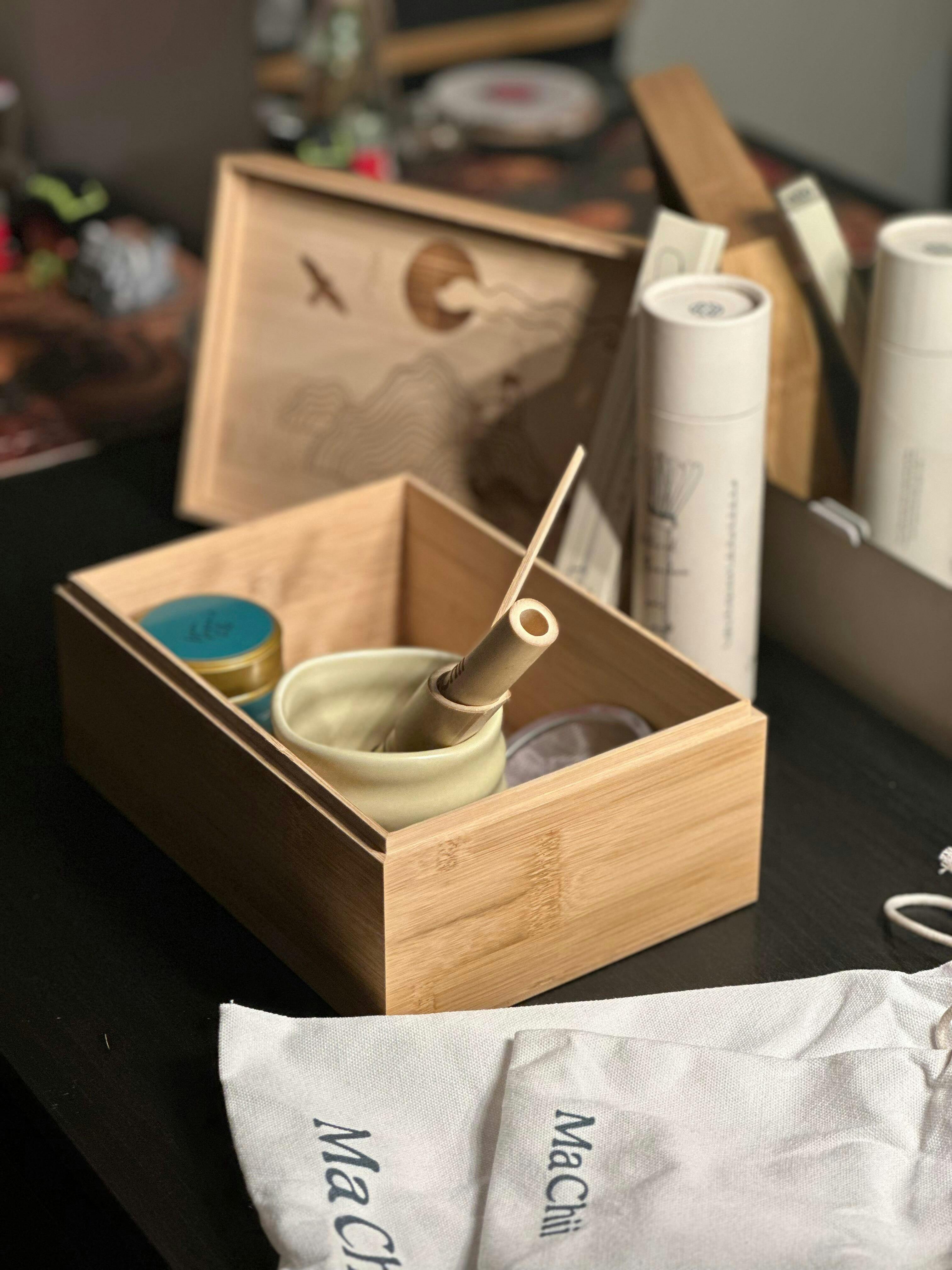 Tea-making set with wooden box, green tea canister, and ceramic container on a white background